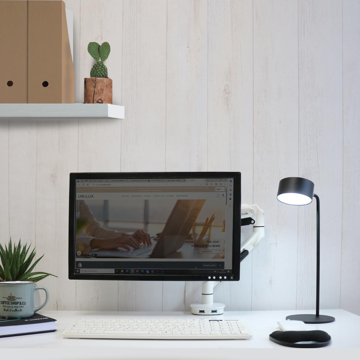 Lampen er udstyret med en touch-knap til enkle indstillinger og giver dig mulighed for at justere lysstyrke og farvetemperatur efter dine præferencer, den har desuden et elegant design og varme farveindstillinger, og de skridsikre puder beskytter dine skrivebordsoverflader.