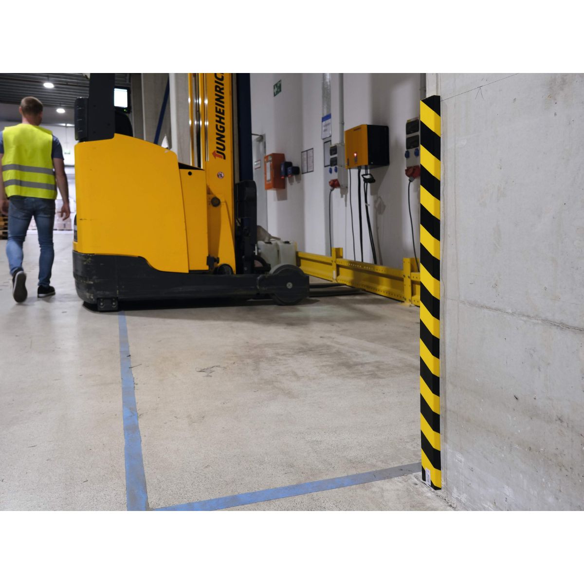 Advarsels- og beskyttelsesprofiler som denne vægbeskyttelse anvendes i industrier og andre indendørs miljøer for at beskytte personer, køretøjer og møbler i tilfælde af mindre kollisioner. De sort/gule striber advarer mod fremspringende overflader, og polyuretanskummet, som beskyttelsesprofilen er fremstillet af, er stødabsorberende. Den selvklæbende vægbeskyttelse skæres til i den ønskede længde med en skarp kniv. Stærk, selvklæbende overflade af god kvalitet, der klæber på metal, træ, pap og fliser med bedste resultat ved en temperatur på 10-30 °C. Farvenuancer i henhold til ASR A1.3 svarende til RAL 1004/9003 (signalgul/signal-sort). Testet i henhold til brandklassificering DIN EN 13501-1 klasse E. Temperaturbestandig fra -30°C – + 70°C. Længde 1 m. Profilen er 60 mm bred og 20 mm tyk.