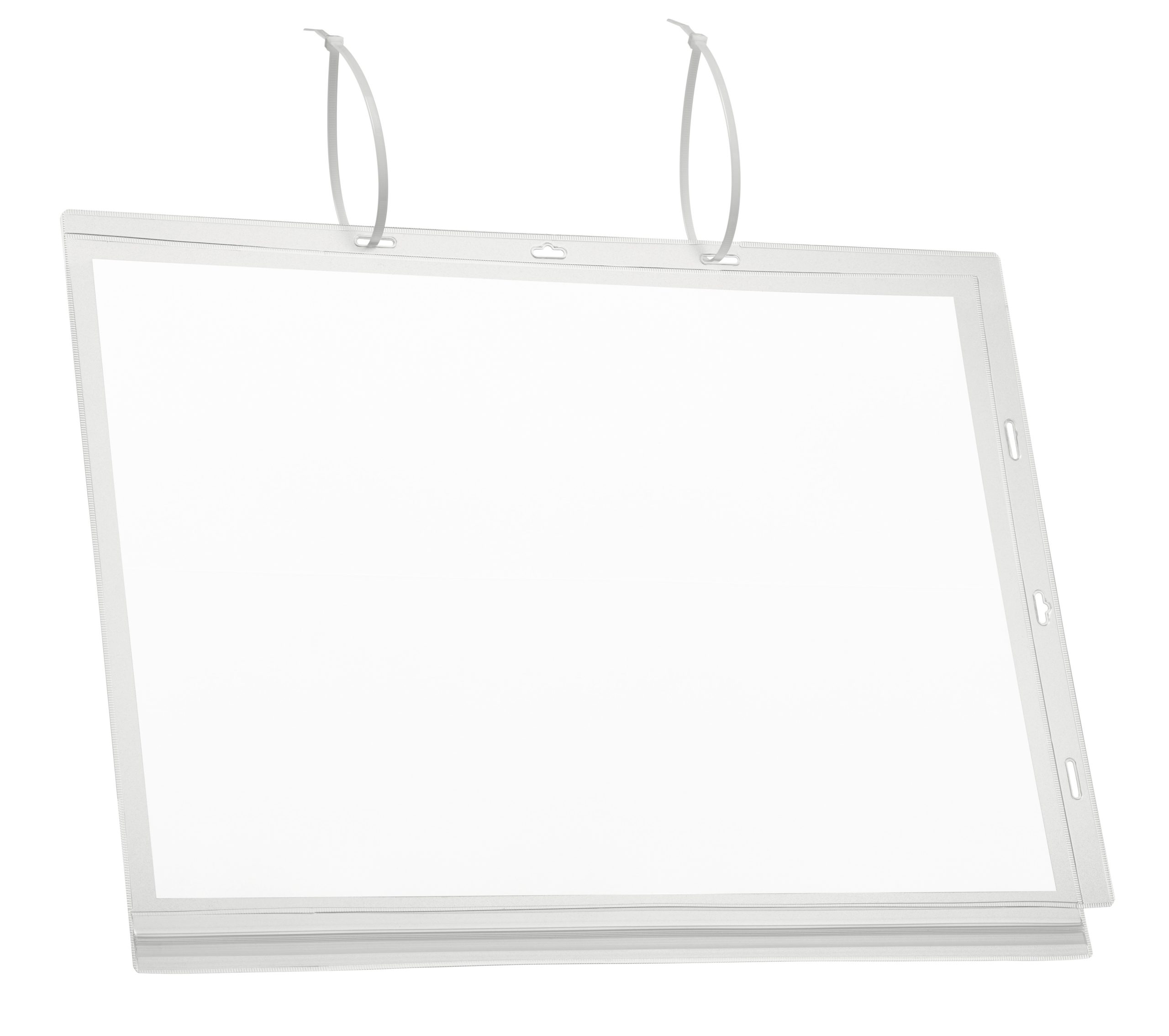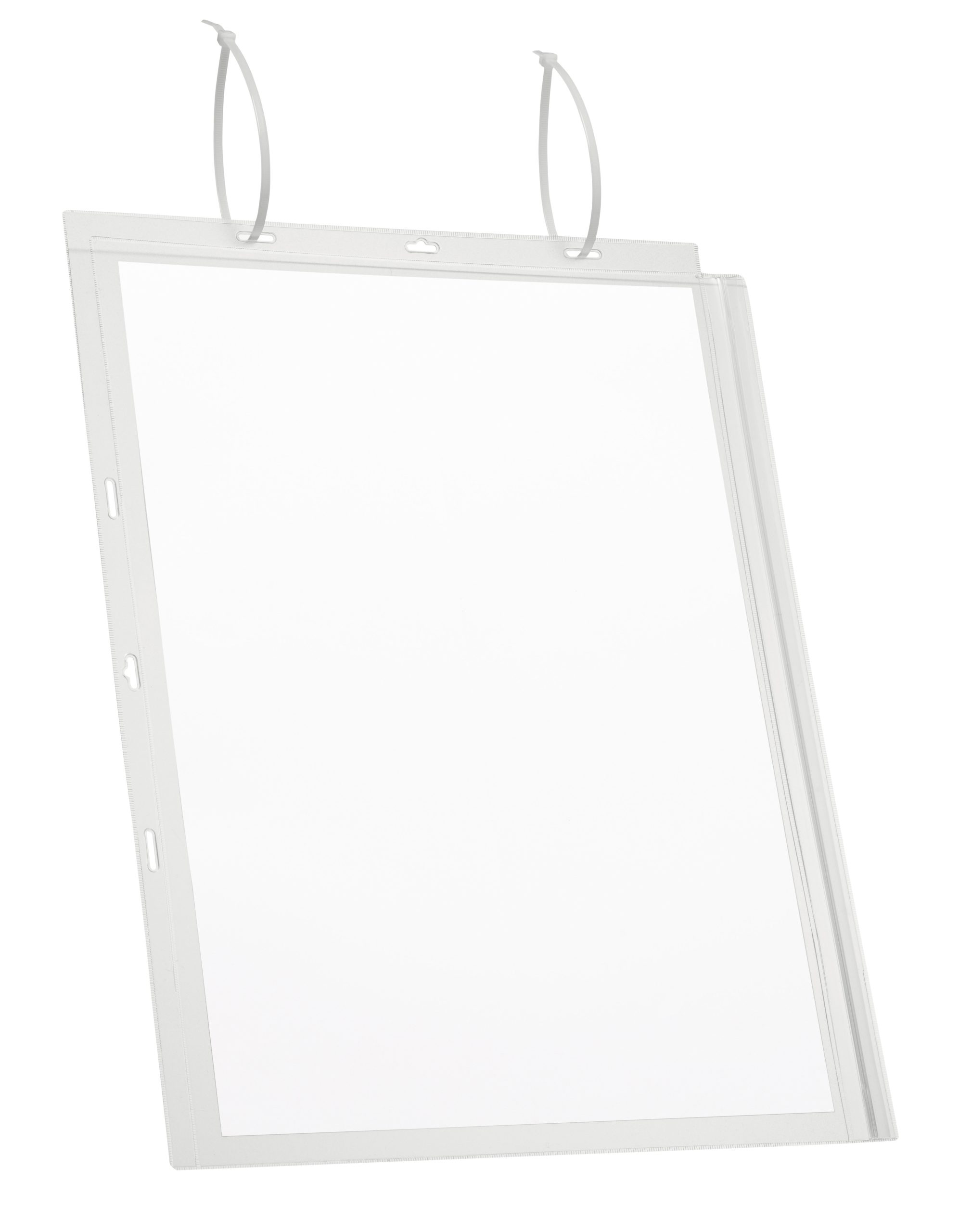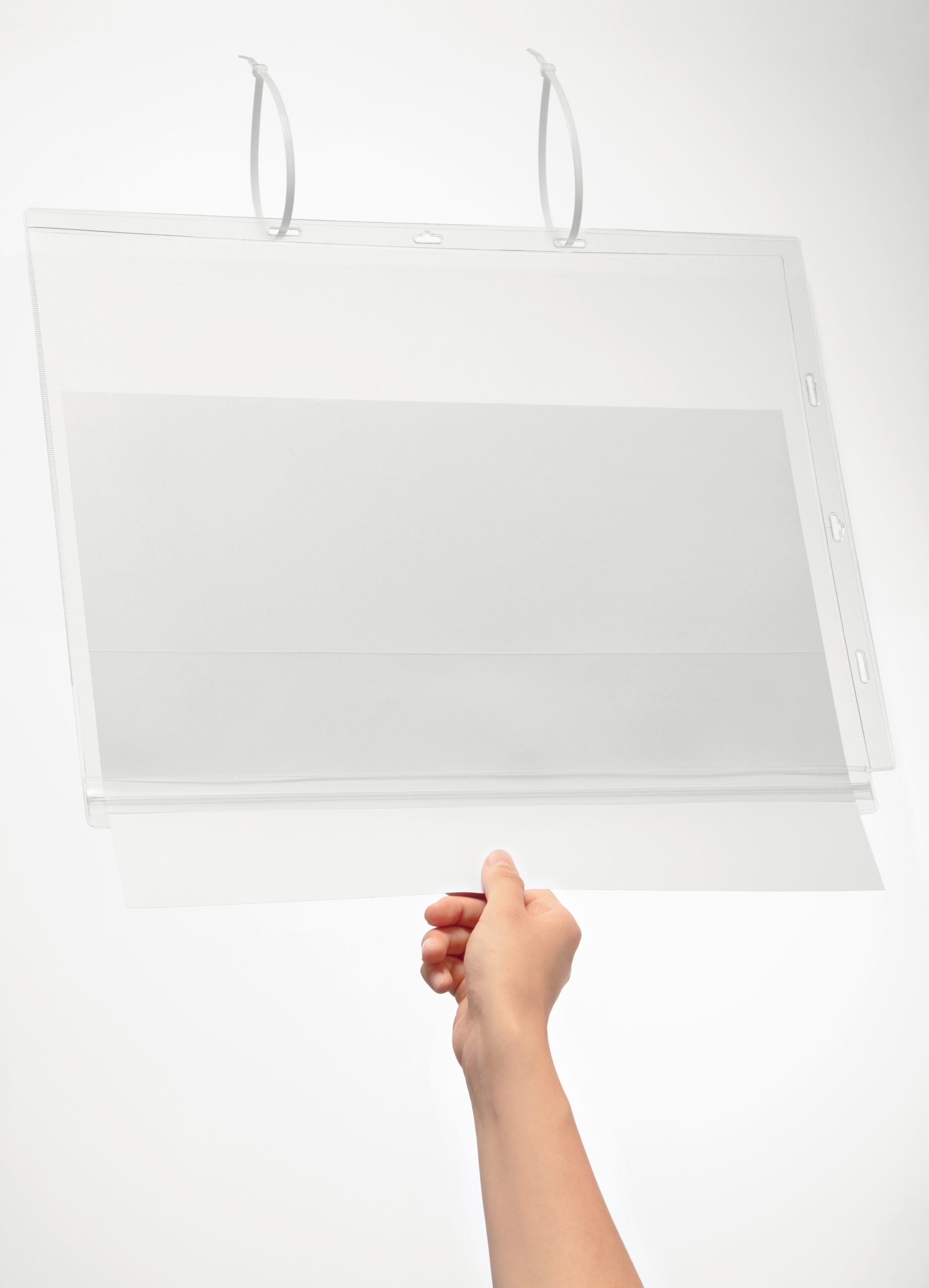 Vandtæt*, robust infolomme med trykforsegling, der beskytter indersiden mod regn, fugt, vandsprøjt og snavs i f.eks. svømmehaller, saunaer, byggemarkeder og havecentre. UV-bestandig, temperaturbestandig fra -20 °C til +60 °C, ridsefast, ikke-reflekterende, vaskbar og desinficerbar er egenskaber, der sikrer, at den bevarer sin form og funktion over tid. Denne høje kvalitet er med til at reducere engangsbrug og affald i overensstemmelse med DURABLE’s Rethink-bæredygtighedskoncept, som fokuserer på at kombinere funktionalitet og kvalitet med miljøansvar. Til dobbeltsidet information i stående eller liggende format medfølger 2 hvide 160g/m2 A3-ark. Skiltet/informationen kan laves ved hjælp af skabeloner, der er tilgængelige i den gratis Duraprint-software. Der medfølger to kabelbindere, som trækkes gennem hullerne i infolommen og fastgøres til f.eks. et gitter. Når infolommen ikke er i brug, anbefales det at opbevare den ved ca. 20 °C og en luftfugtighed på ca. 50 % for at bevare dens kvalitet og lange levetid. 5 lommer i én pose. *Testet efter IPX5-standarden, hvilket betyder, at den kan modstå vandstænk, regn og lavtryksvandstråler fra flere retninger.