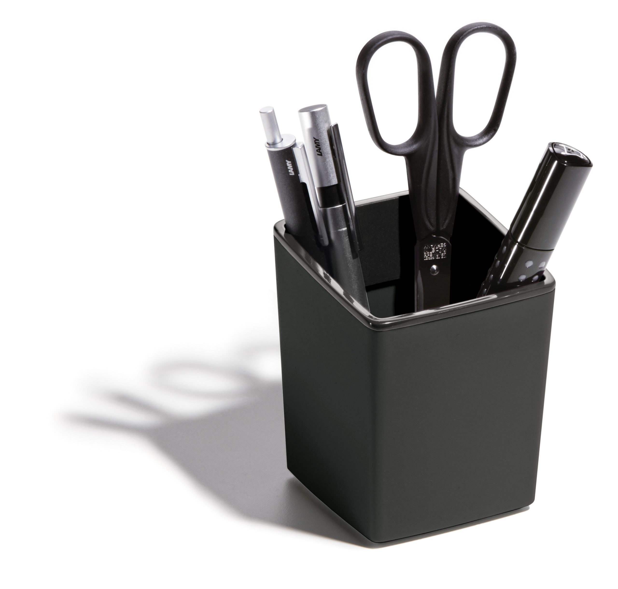 stilren penneholder for penne, sakse, linealer osv. Robust og stabil selv når den er helt fyldt. Med skridsikre gummifødder. Mål: 100 x 79 x 79 mm (HxBxD)