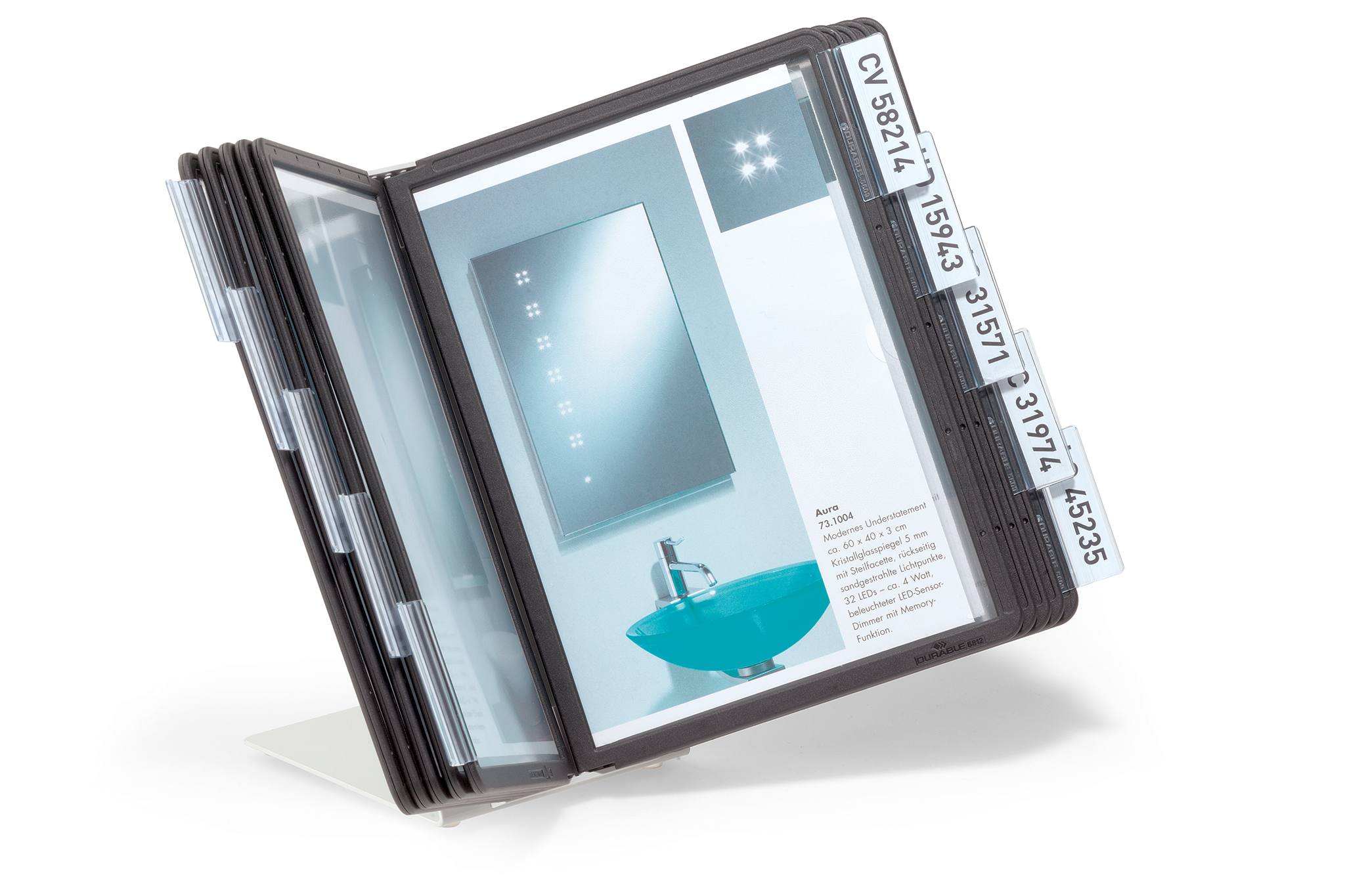Få hurtig adgang til information som du anvender dagligt ved hjælp af displaysystemet VARIO®. Oversigtsystemet er fremstillet af metal hvilket gør det slidstærkt og holdbart. Leveres med 10 stk. sorte lommer A5 i refleksfri polypropylen plast og etiketholder. 5 års garanti hvis produktet har en defekt som skyldes en fabrikationsfejl. https://www.durable.dk/service/durable-garanti/sherpavario-garanti.html