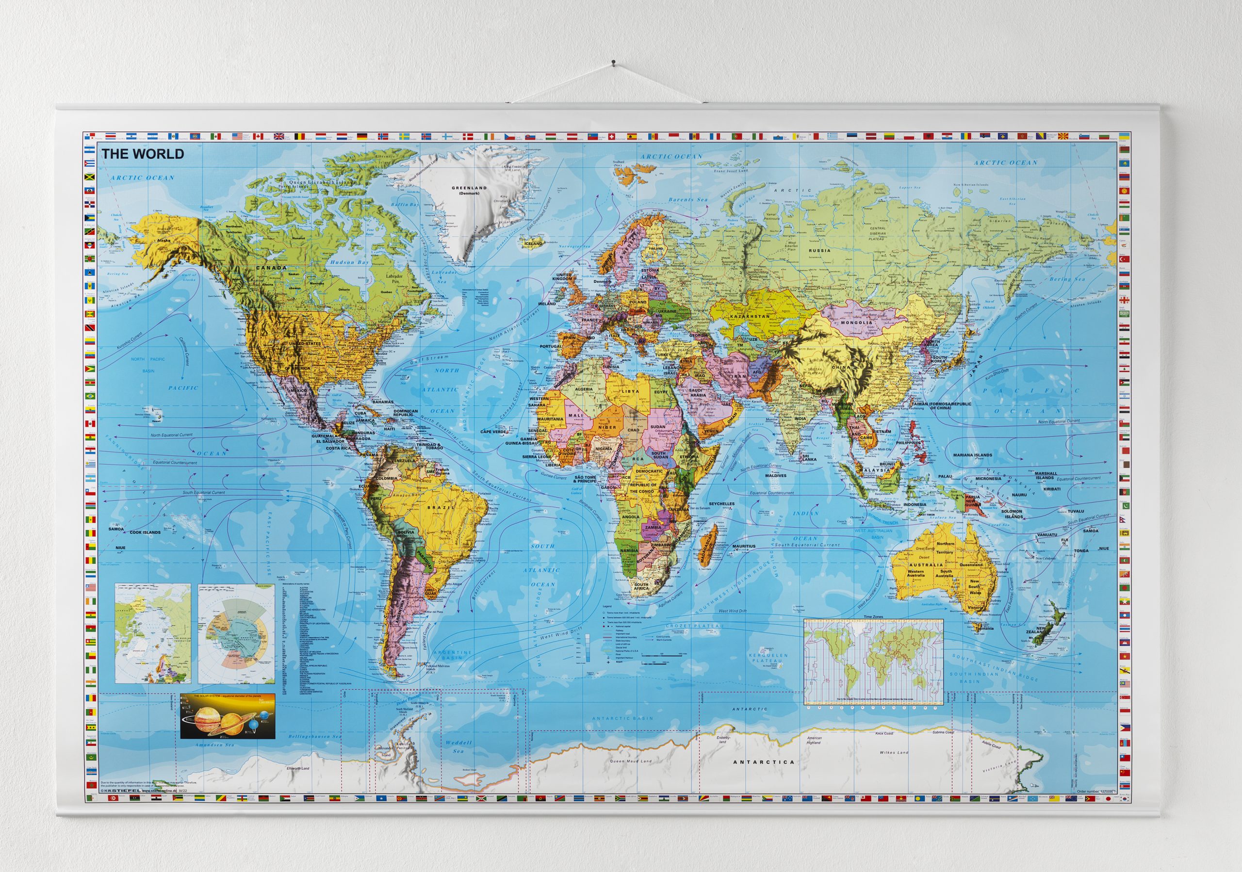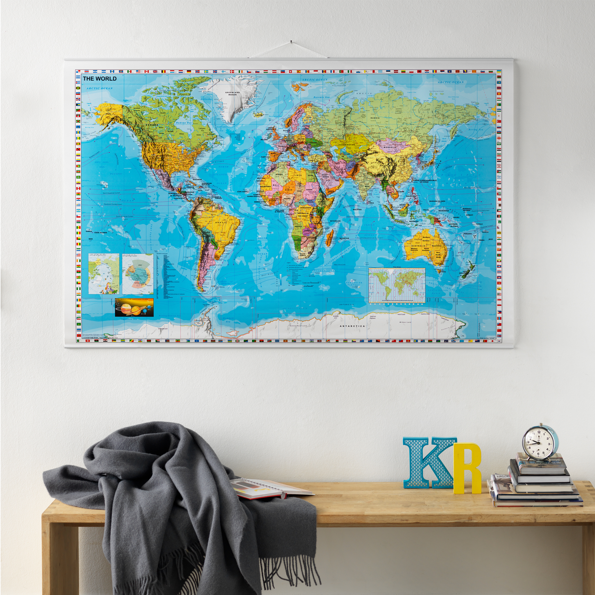 Stort verdenskortFarverigt verdenskort til væggen med ridsefast overflade. Landene er tydeligt afmærket i forskellige farver, og kortet er fyldt med detaljer såsom lande- og bynavne, tidszoner samt længde- og breddegrader. Teksten er på engelsk, og langs kortets kant pryder flag fra verdens forskellige nationer. Verdenskortet er perfekt til væggen på kontoret, gæsteværelset eller entreen, hvor det både fungerer som dekoration og læringsværktøj.Kortet er lamineret og har en praktisk skriv- og visk-ud funktion, der gør det muligt at skrive eller markere direkte på overfladen med kridt markere eller almindelige whiteboard-tuscher. Når teksten er tør, kan den nemt fjernes med en mikrofiberklud.Verdenskortet leveres med metalskinner i top og bund, hvilket sikrer, at det hænger flot og fladt mod væggen. Øverst sidder en ophængssnor, som gør det nemt at hænge kortet op på et søm eller en skrue.Verdenskortet leveres rullet i et beskyttende paprør og måler 137 x 89 cm, når det er foldet ud.Se hele udvalget af verdenskort og europakort.