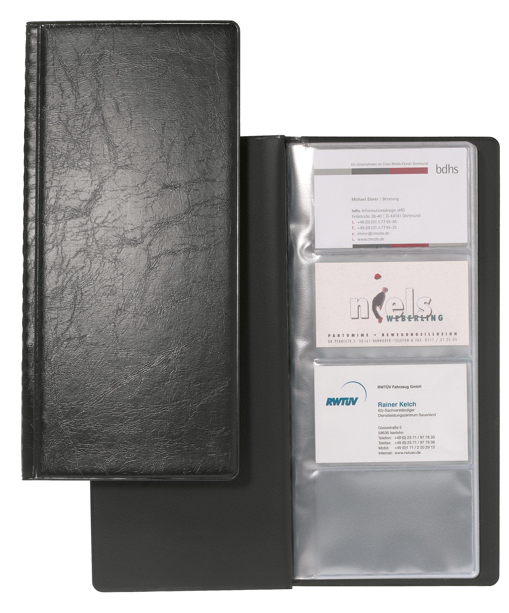 Visitkortmappe med overflade i læderlook Med indsvejsede lommer Til 128 visitkort i størrelsen 90 x 57 mm