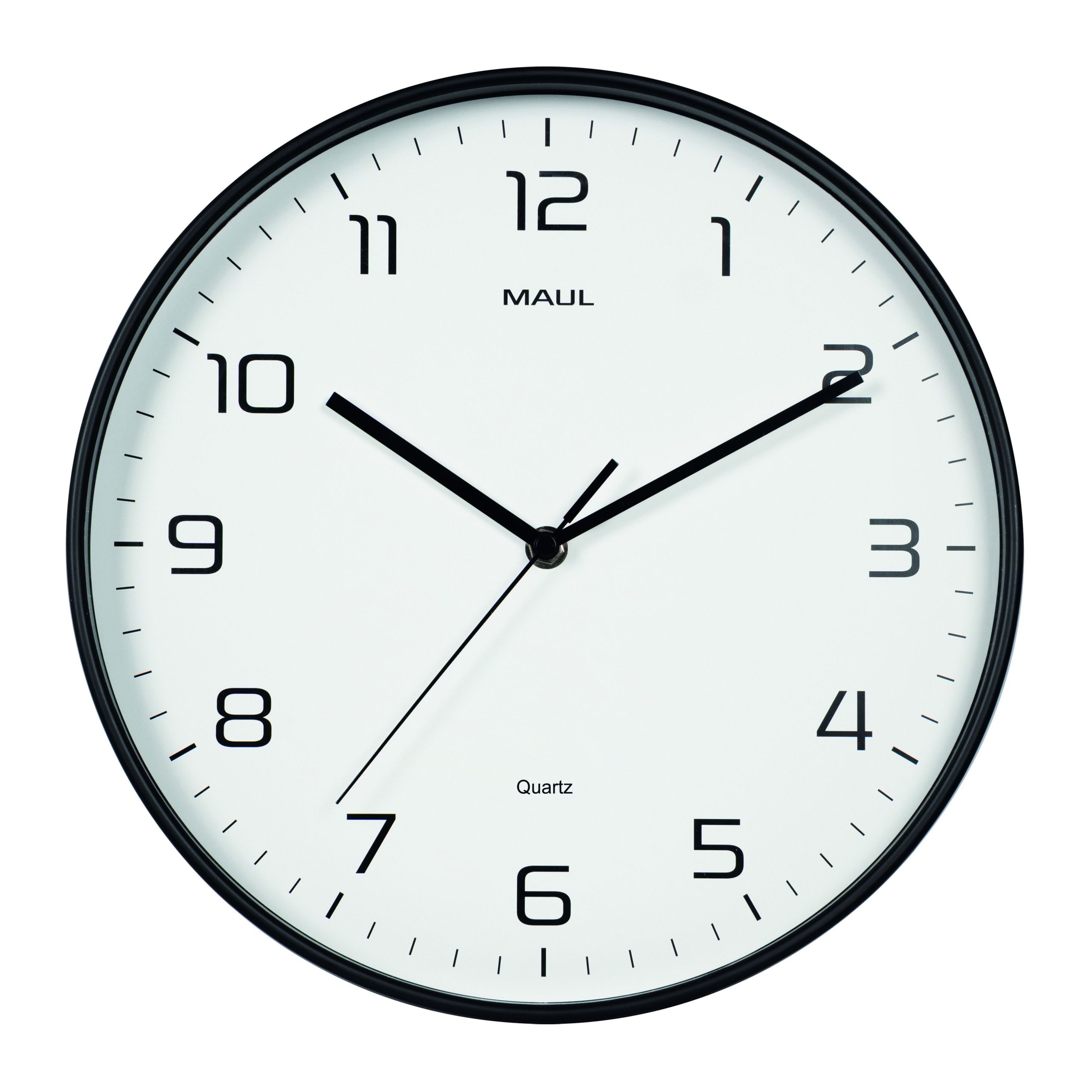Vægur, sort, MAULdrip, Ø30 cm Stilrent vægur med en smal, mat sort plastramme, der giver et moderne og minimalistisk udtryk. Det elegante og enkle design passer perfekt ind i både kontorer, mødelokaler og hjem, hvor der ønskes et diskret og professionelt look. Den hvide urskive med tydelige timetal og minutmarkeringer gør tiden let at aflæse – også på afstand. Uret er udstyret med et præcist quartz-urværk, glidende sekundviser og fladt mineralglas, som beskytter urskiven. Væguret monteres nemt via integreret ophængsøje og drives af 1 x AA batteri (medfølger ikke). Mål: Ø 30 x 5 cm.