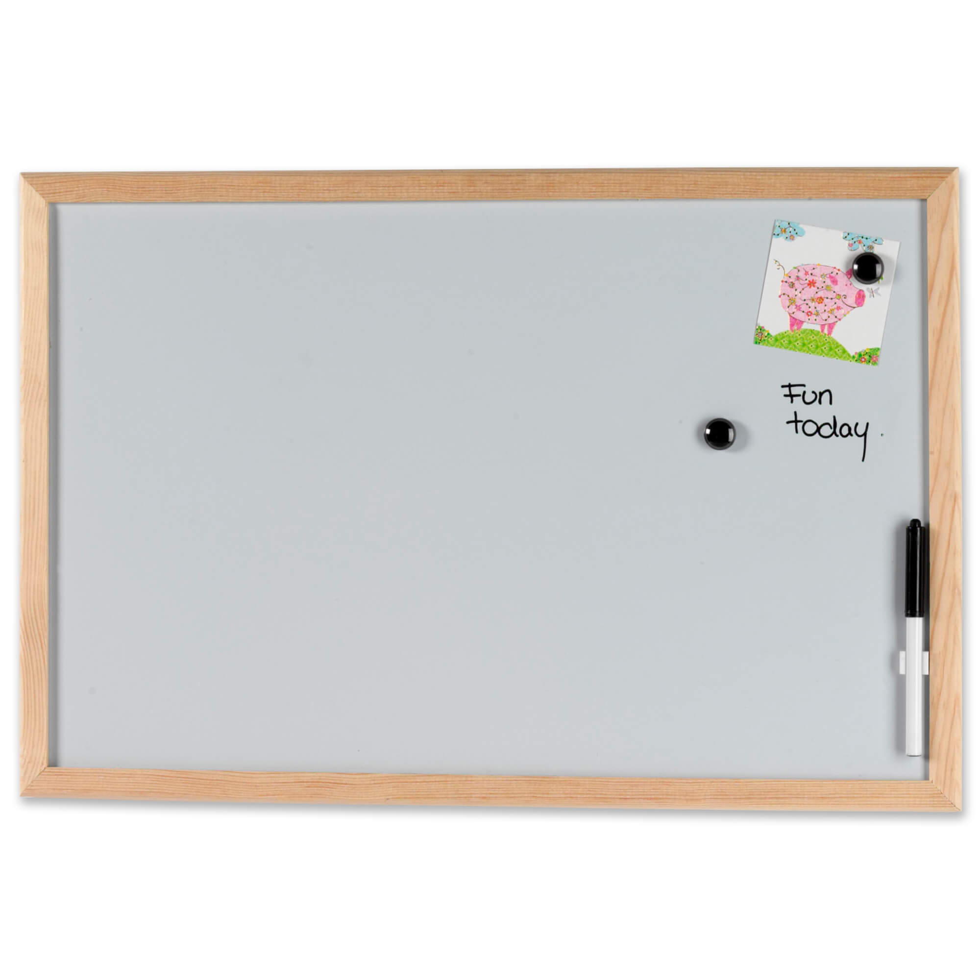 Magnetisk whiteboard tavle 60 x 40 cm. med fyrtræsramme.Skriv på tavlen med en marker, og sæt ting op på den med magneter. Incl. 1 marker, og 2 magneter.
