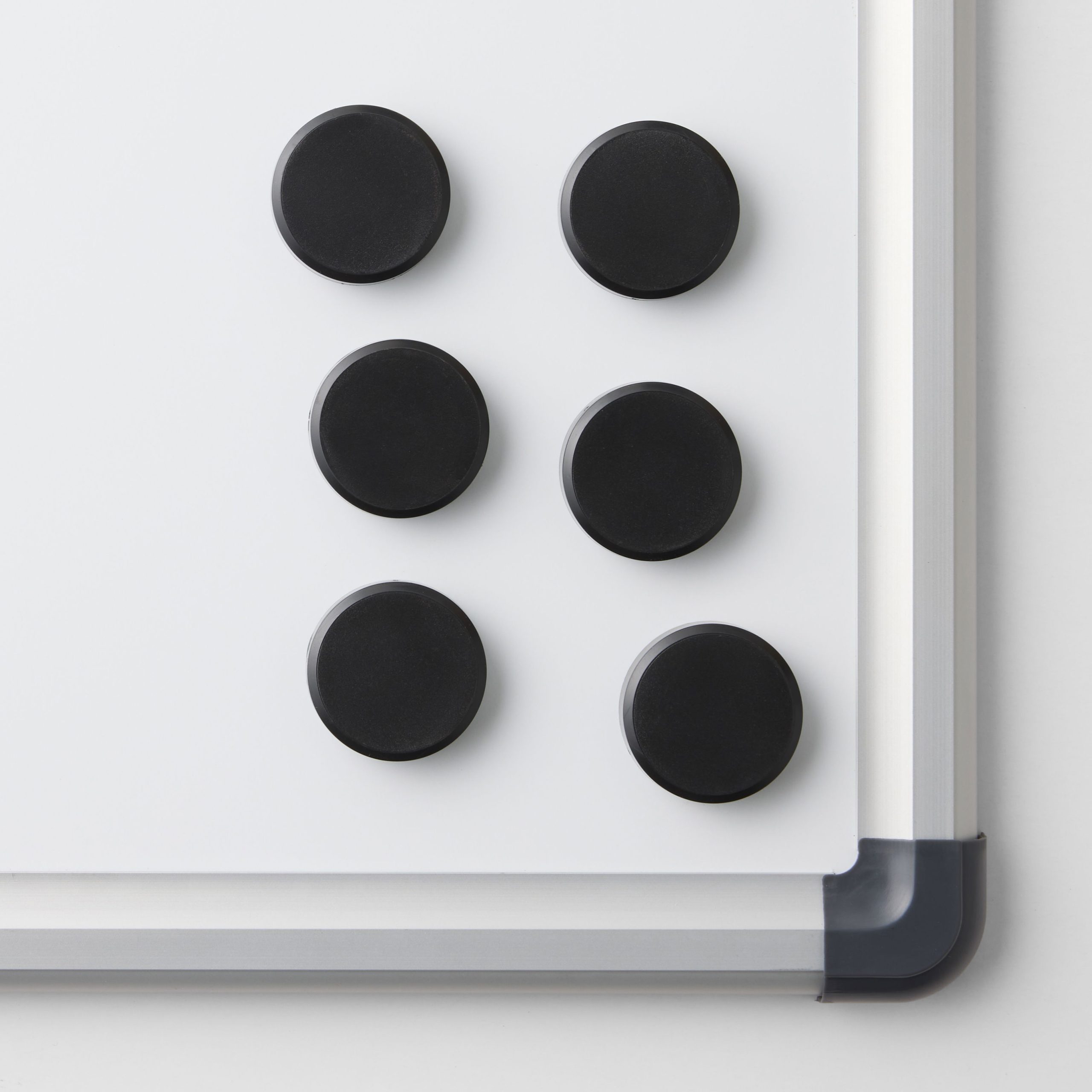Whiteboard magneter, Sort, 6 stk Disse sorte whiteboard magneter er perfekte til at fastgøre billeder, dokumenter eller huskesedler på din whiteboardtavle på kontoret eller i hjemmet. Magneterne kan også med fordel bruges som køleskabsmagneter til tegninger eller indkøbslister. Bemærk venligst, at disse magneter ikke er super stærke magneter og derfor ikke egner sig til glastavler. De er udviklet specifikt til brug på stål- og whiteboardoverflader. Magneterne er sorte og har en diameter på 3 cm. Leveres i pakke med 6 stk.