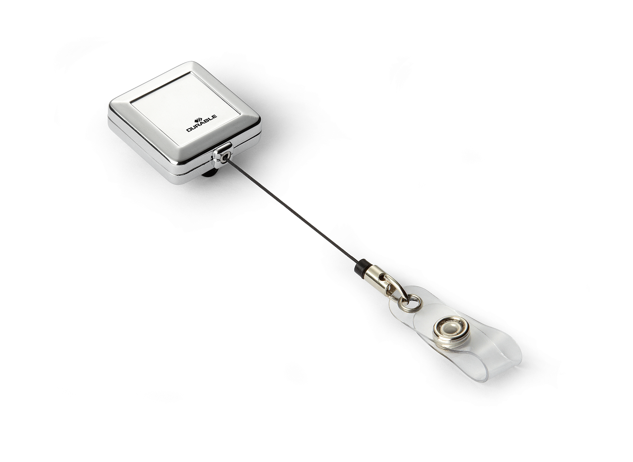 Forkromet firkantet yoyo-holder med plaststrop med trykknap, velegnet til navneskilte og kortholder med hul. Metalclips på bagsiden af yoyo til fastgørelse til dit bælte eller linning. Kan trækkes ud til 80 cm længde.