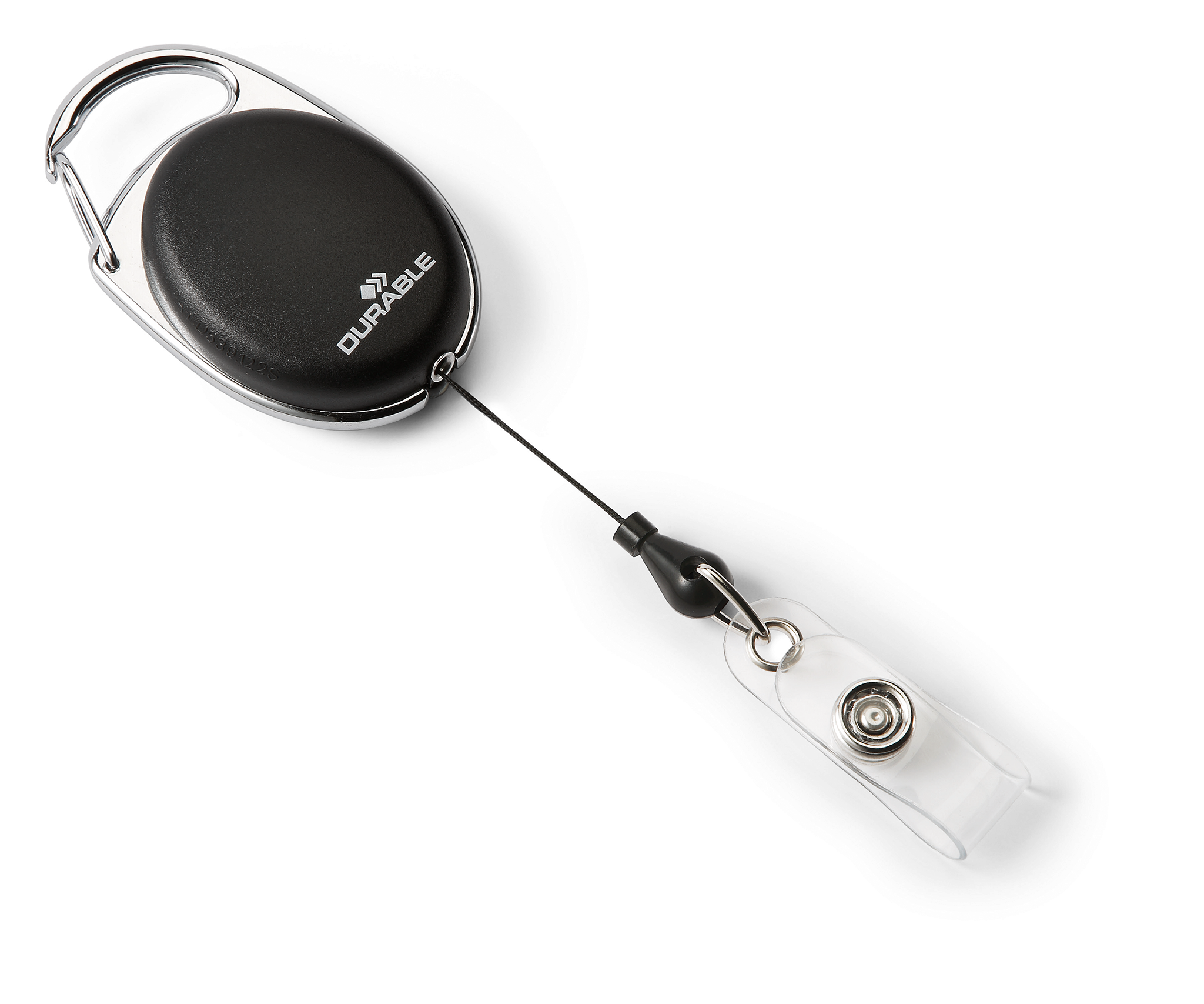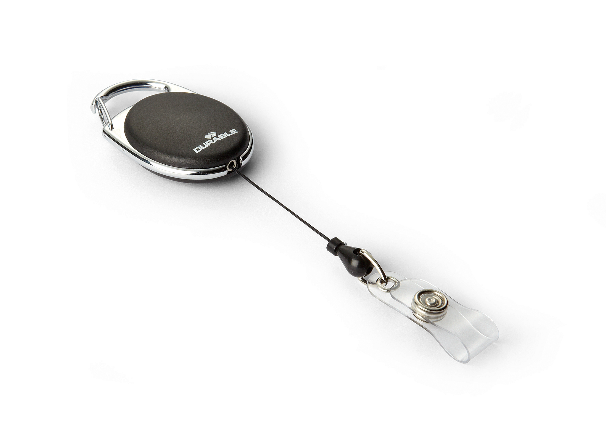 Oval udtrækkelig yoyo-holder nøglering med plaststrop med trykknap til kortholder og navneskilte Metalkroge til fastgørelse på f.eks. buksestrop Kan trækkes ud til 80 cm længde
