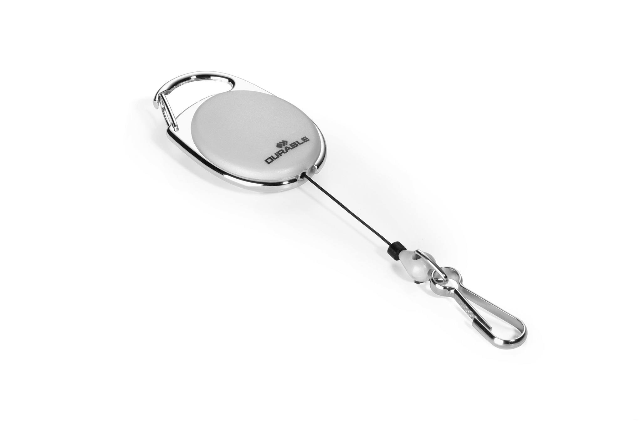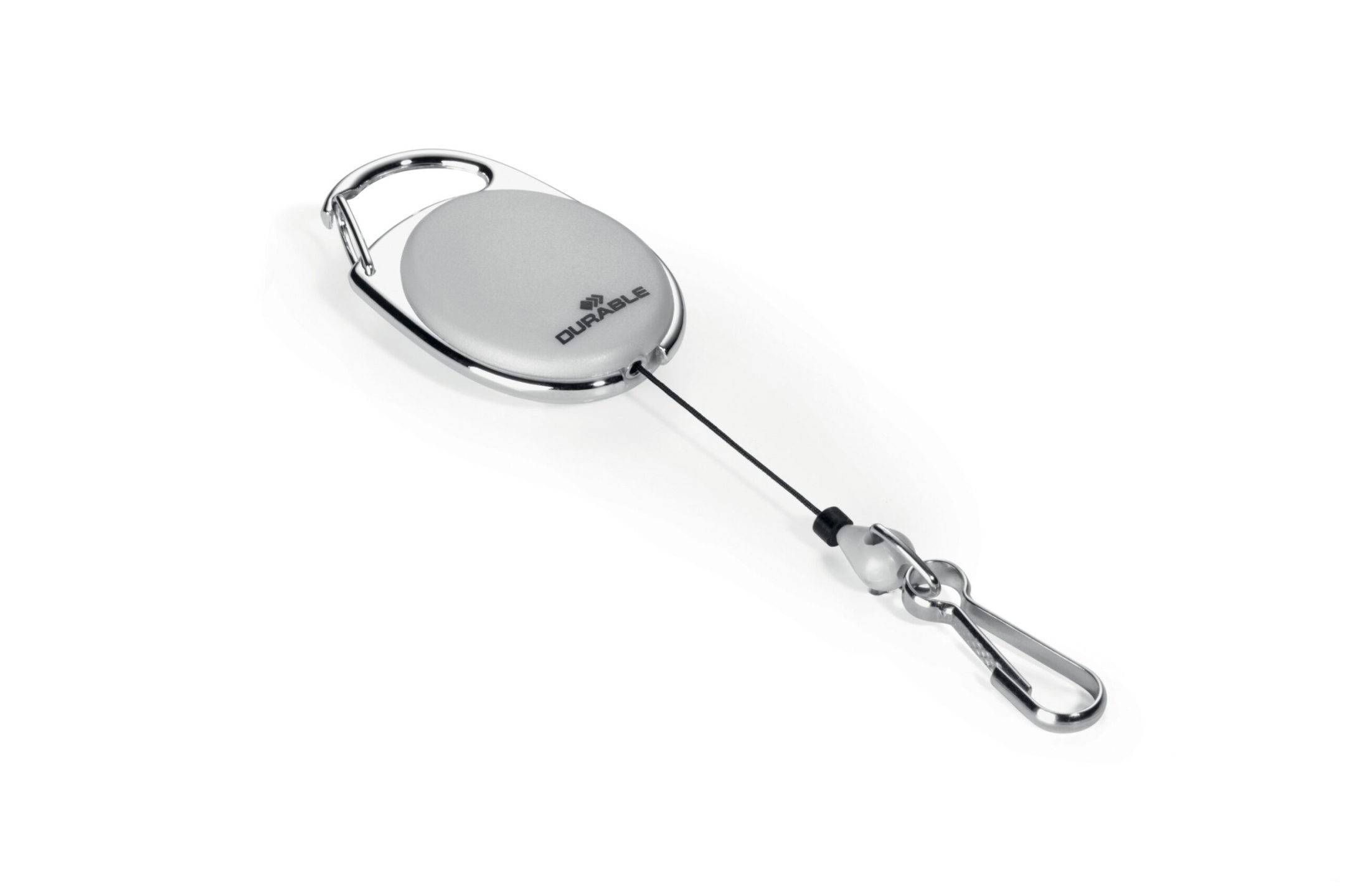Yoyo-holder med metalkrog, velegnet til navneskilte og kortholder med hul. Topklemme til fastgørelse i buksestrop. Kan trækkes ud til 80 cm længde. En individuelt pakket i blisterpak pose.