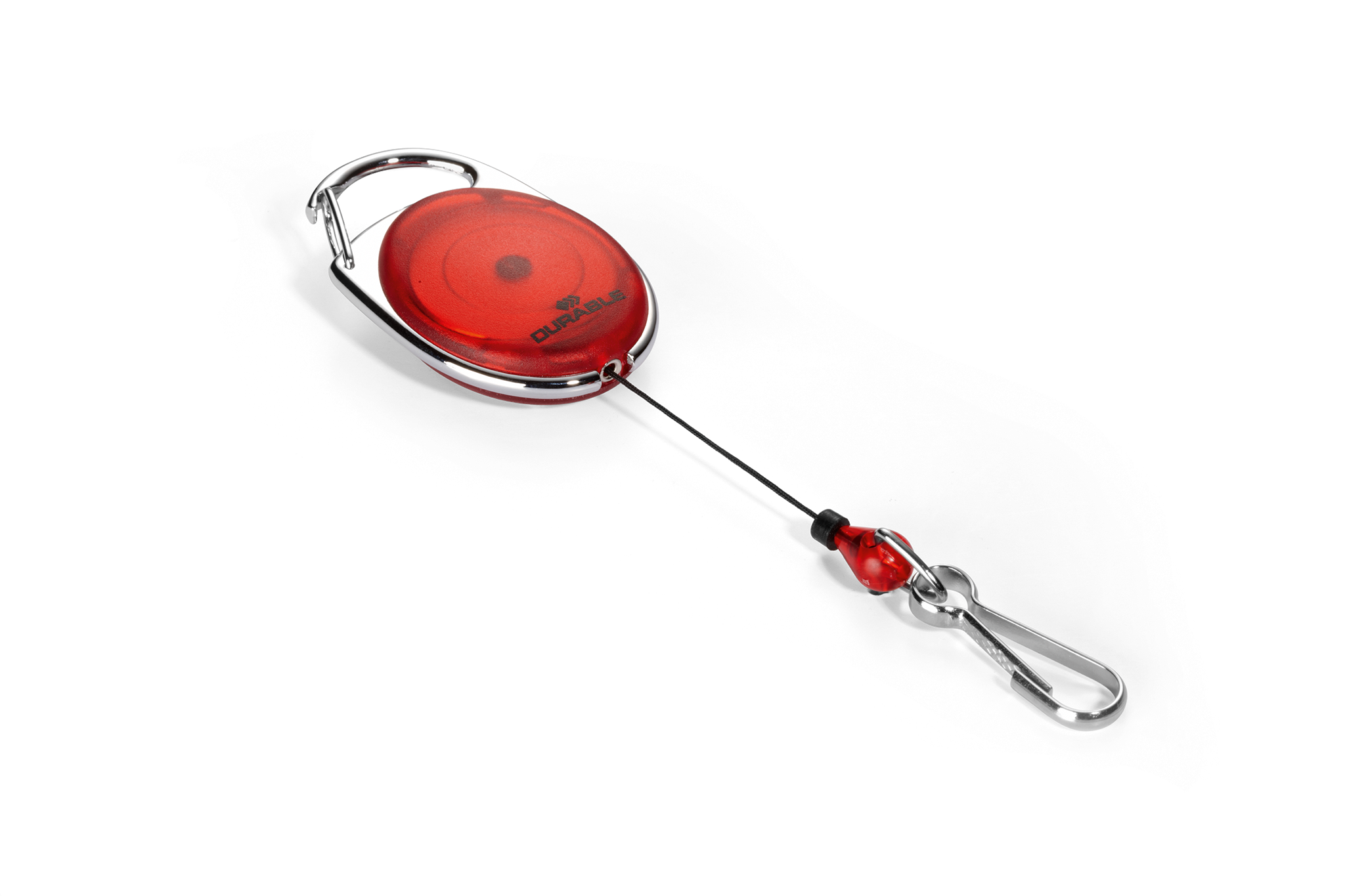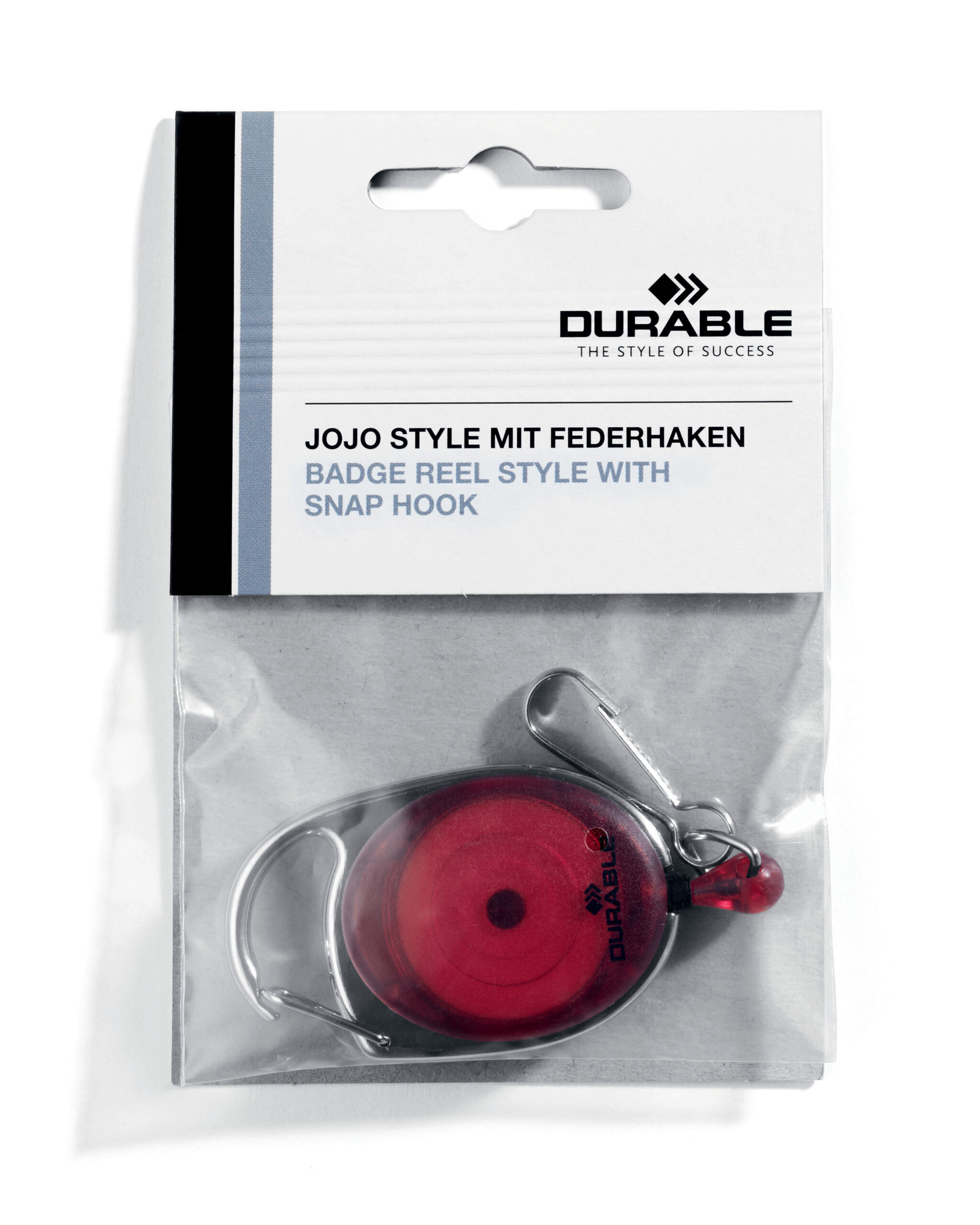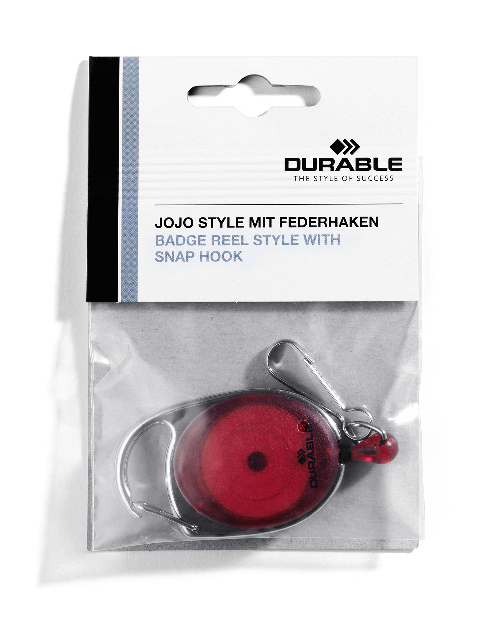 Yoyo-holder med metalkrog, velegnet til navneskilte og kortholder med hul. Topklemme til fastgørelse i buksestrop. Kan trækkes ud til 80 cm længde. En individuelt pakket i blisterpak pose.
