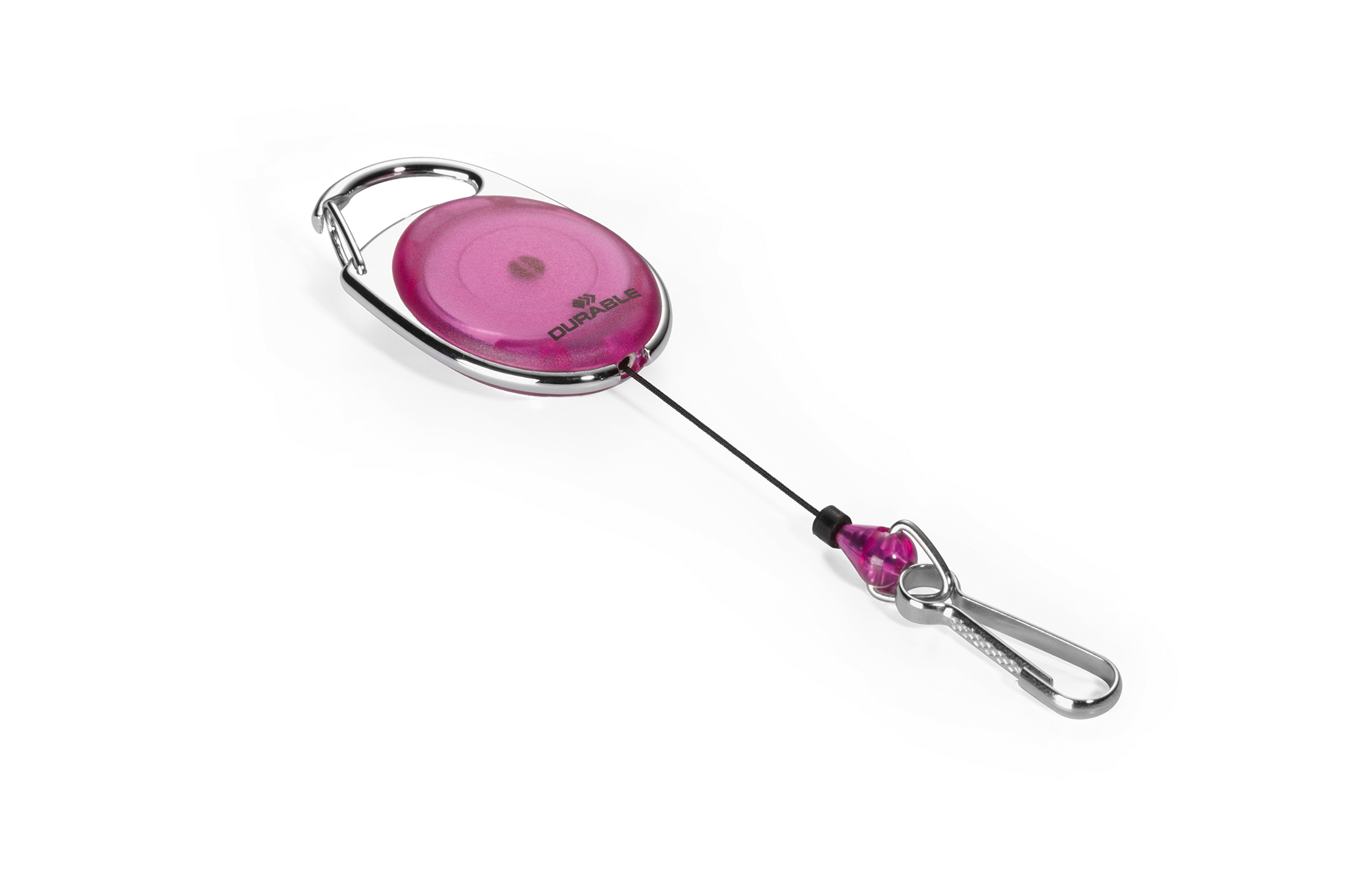 Yoyo-holder med metalkrog, velegnet til navneskilte og kortholder med hul. Topklemme til fastgørelse i buksestrop. Kan trækkes ud til 80 cm længde. En individuelt pakket i blisterpak pose.