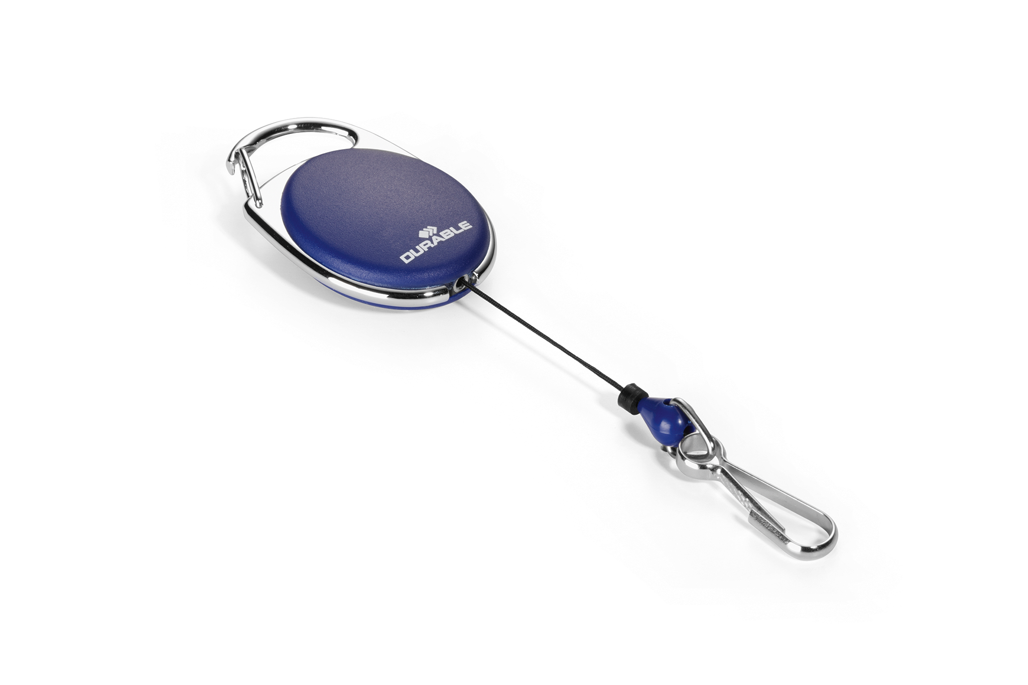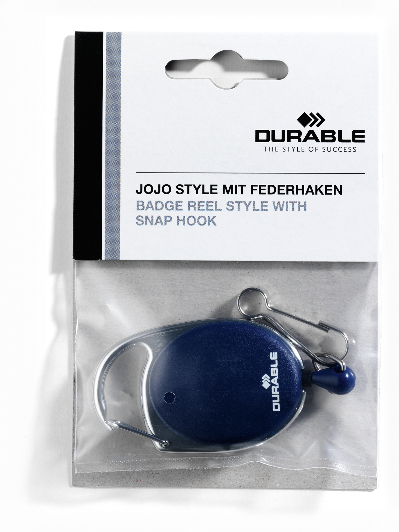 Yoyo-holder med metalkrog, velegnet til navneskilte og kortholder med hul. Topklemme til fastgørelse i buksestrop. Kan trækkes ud til 80 cm længde. En individuelt pakket i blisterpak pose.